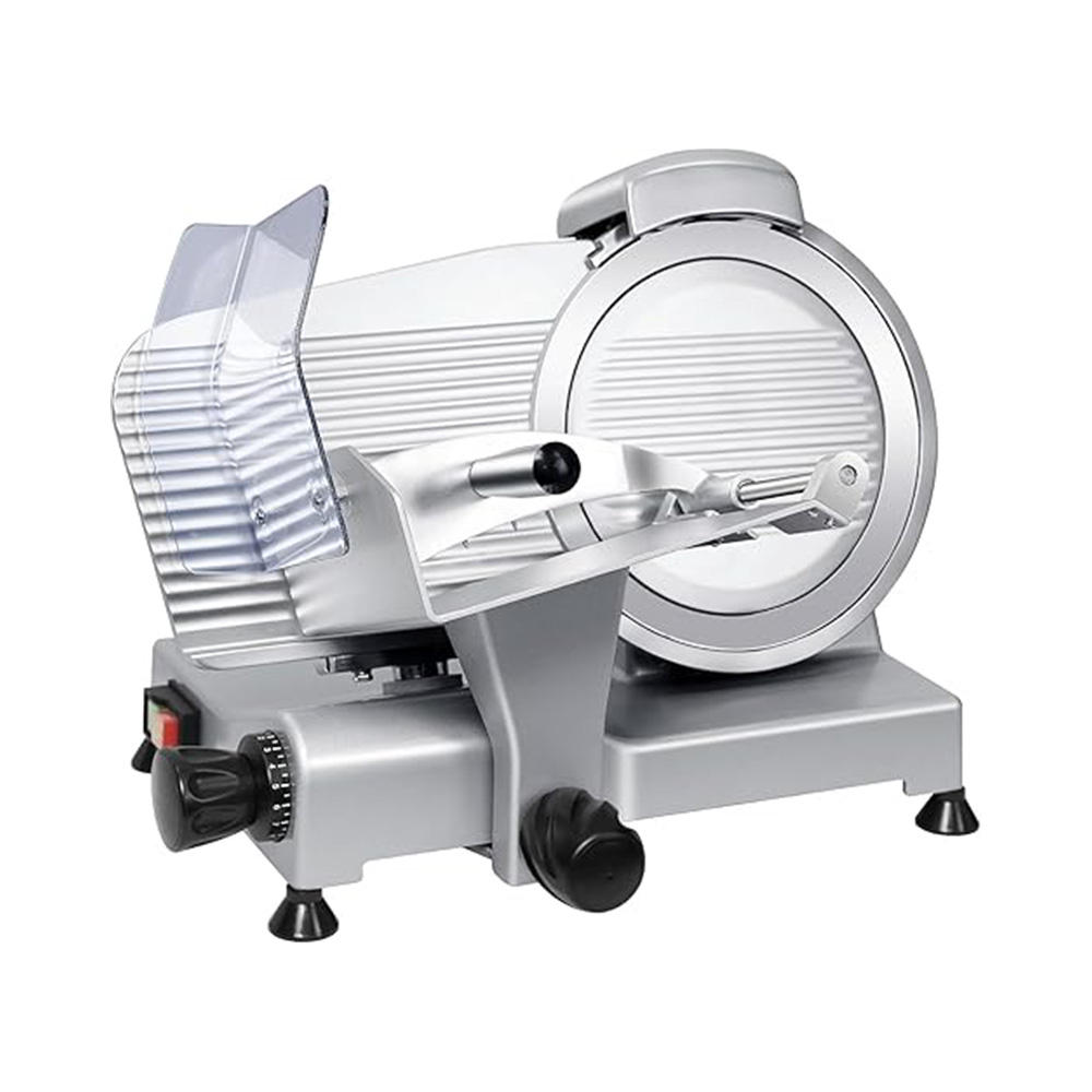 Equipped with a protective blade guard and non-slip feet for stable operation. The ergonomic design ensures comfort and safety while slicing.
