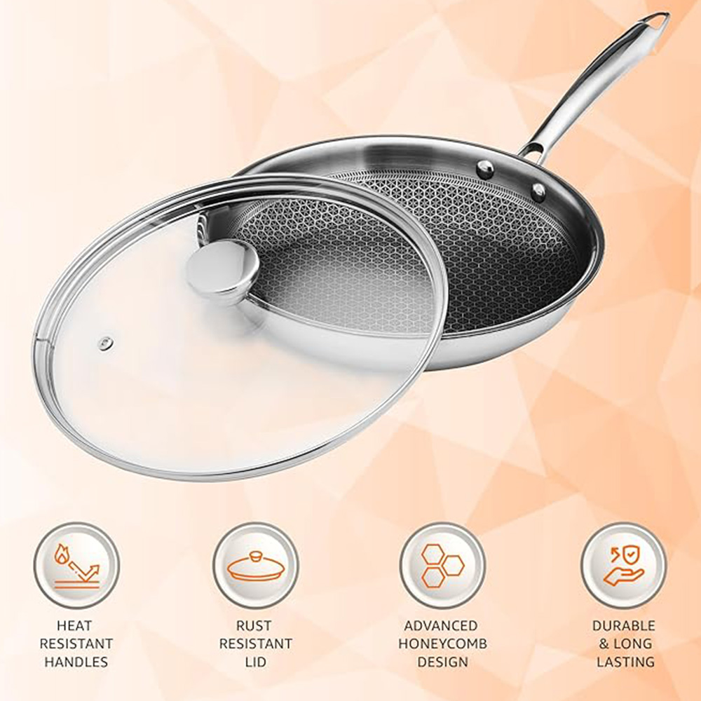 Made with a tri-ply base, this wok pan distributes heat uniformly across the surface. It prevents hot spots and ensures your food cooks perfectly every time. - Honeycomb Surface for Superior Non-Stick Cooking