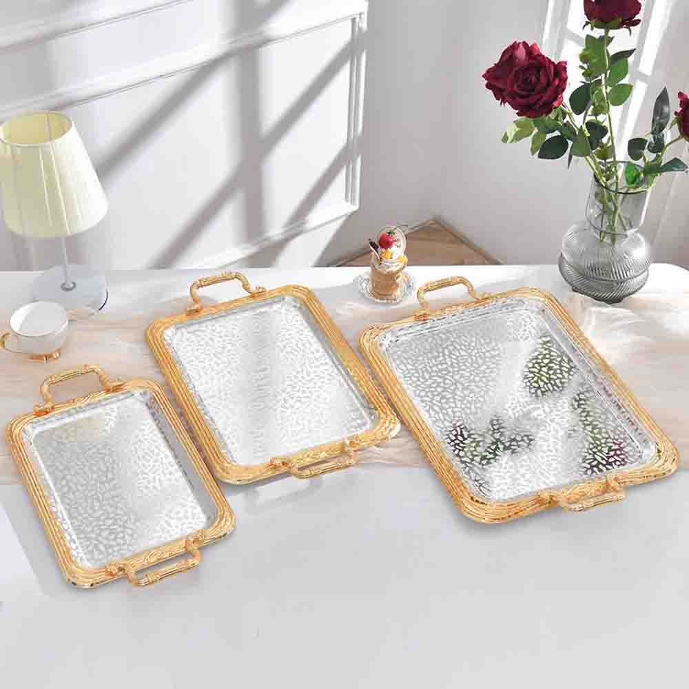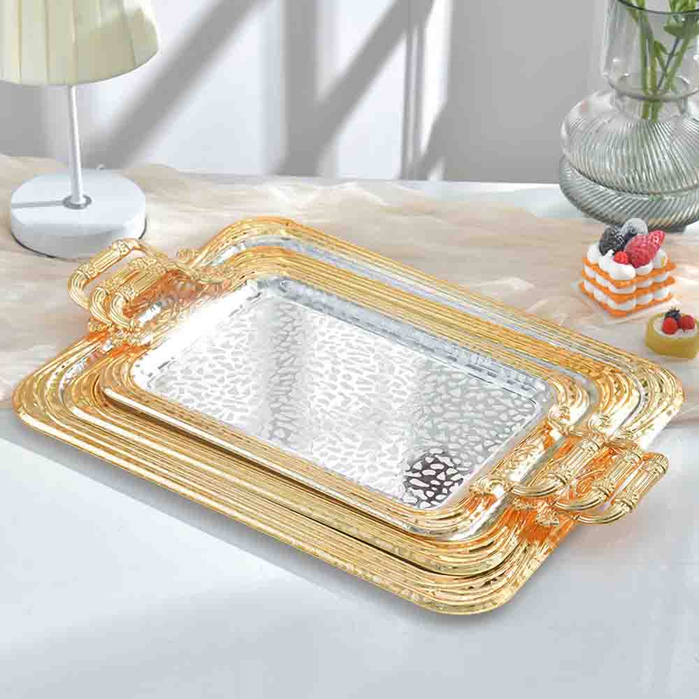 This luxury serving tray features a rich gold finish with a polished surface. It enhances presentation and instantly elevates any table setting. Ideal for serving drinks, desserts, or decorative items.